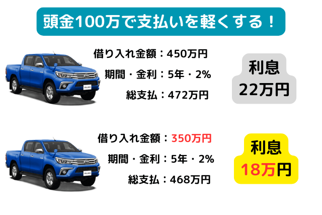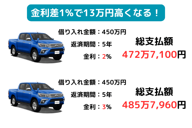 ハイラックス乗り出し価格450万円として、金利2%と3%。