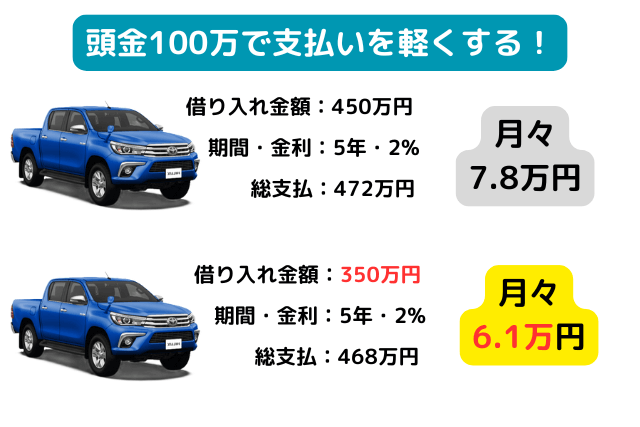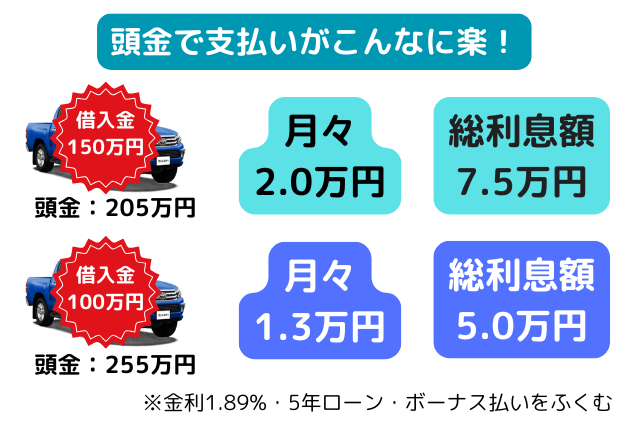 毎月の支払いを抑えるには、今の車をできるだけ高く売って、頭金を入れることです。