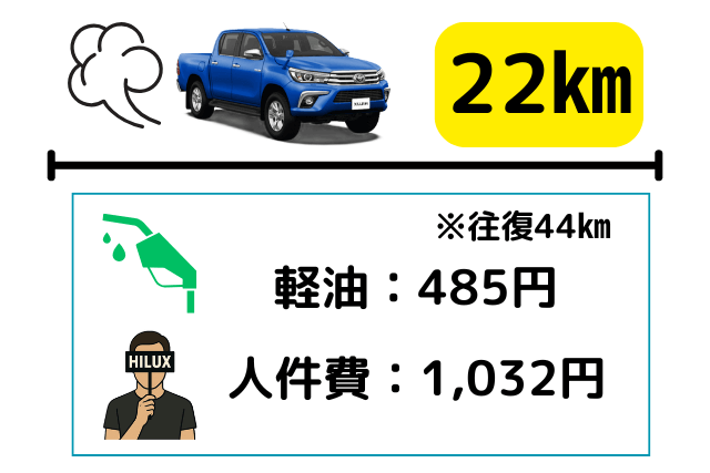 ハイラックスの燃費が11.7㎞/Lだと、必要な軽油は855L。