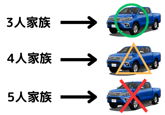 ハイラックスは5人乗りですが、後ろに3人座るのは現実的ではありません。