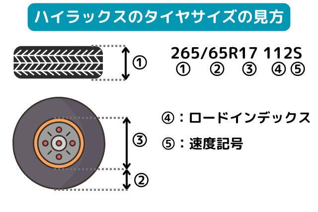 ハイラックスのタイヤサイズ表記『265/65R17 112S』の意味を解説する図。①タイヤ幅、②扁平率、③リム径、④ロードインデックス(荷重指数)、⑤速度記号を図解で分かりやすく示している。