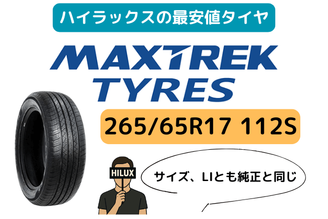 ハイラックスに適合する最安値タイヤとしてMAXTREK TYRES製265/65R17 112Sを紹介する図。サイズ・ロードインデックス・速度記号すべて純正と同じであることを示し、安価でも基準は満たしていると強調。