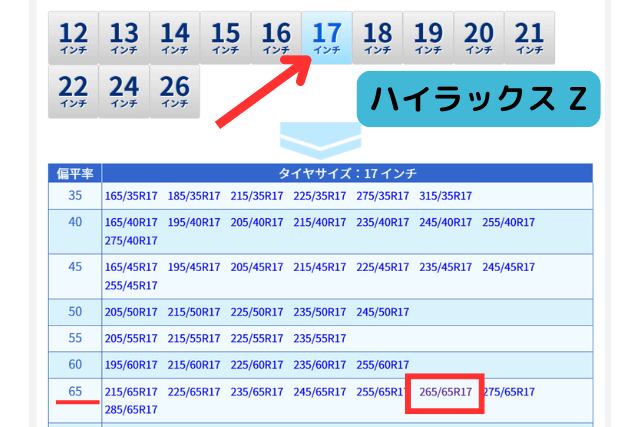 ハイラックス のタイヤサイズを選びます。