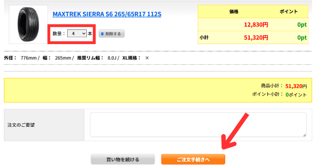 タイヤは1本から買えるので、必要な本数を選択。